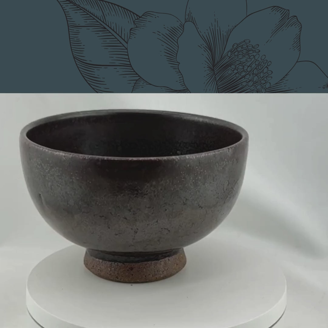 Diese Chawan wirkt, als hätte sie die Nacht selbst aufgenommen. Die Oberfläche zeigt ein lebendiges Spiel aus tiefem Schwarz und silbrig aufbrechenden Strukturen – ein Effekt, der an feinste Kuro-yū 黒釉 Glasuren erinnert. Die Form ist eine klare, harmonische Wan-gata 碗形: sanft bauchig, weit öffnend, geschaffen für ruhige, konzentrierte Momente mit Matcha. Der Rand ist präzise gezogen, die Wandungen gleichmäßig und dennoch sichtbar handgeformt, während der unglasierte Kodai 高台 eine raue, erdige Textur zeigt.