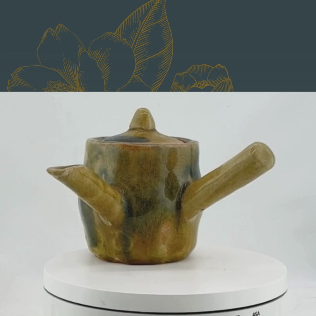 Diese handgefertigte Kyusu wirkt, als trüge sie noch die Wärme des Ofens in sich. Ihre Glasur verläuft in weichen Übergängen von erdigem Ocker zu tiefen, rauchigen Grüntönen – ein Farbspiel, das an die japanische 野焼き Noyaki-Tradition erinnert, bei der Feuer, Asche und Zufall gemeinsam die Oberfläche gestalten. Die unregelmäßigen Linien, die kleinen Erhebungen und die natürliche Rauheit machen sofort deutlich, dass dieses Gefäß nicht industriell entstanden ist, sondern mit echter Hingabe geformt wurde.